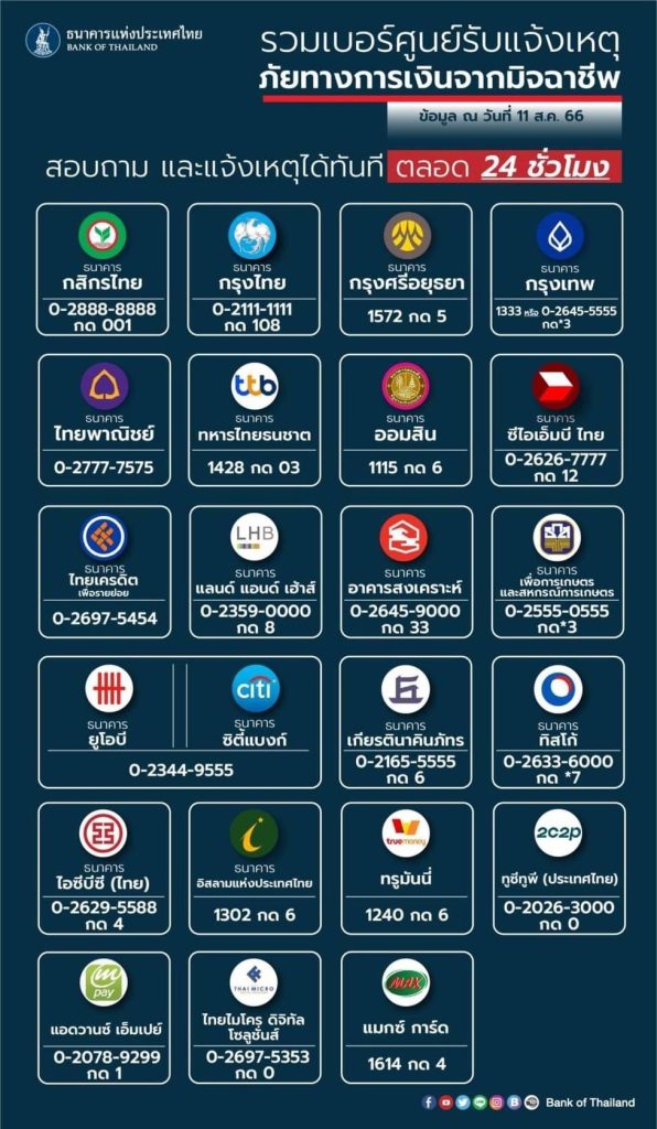 (1) แจ้งธนาคารทันที ผ่านเบอร์ศูนย์รับแจ้งเหตุ hotlineเพื่อให้ระงับธุรกรรมชั่วคราวช่วยตัดตอนเส้นทางการเงิน (หมายเลขโทรศัพท์ล่าสุดตามนี้)