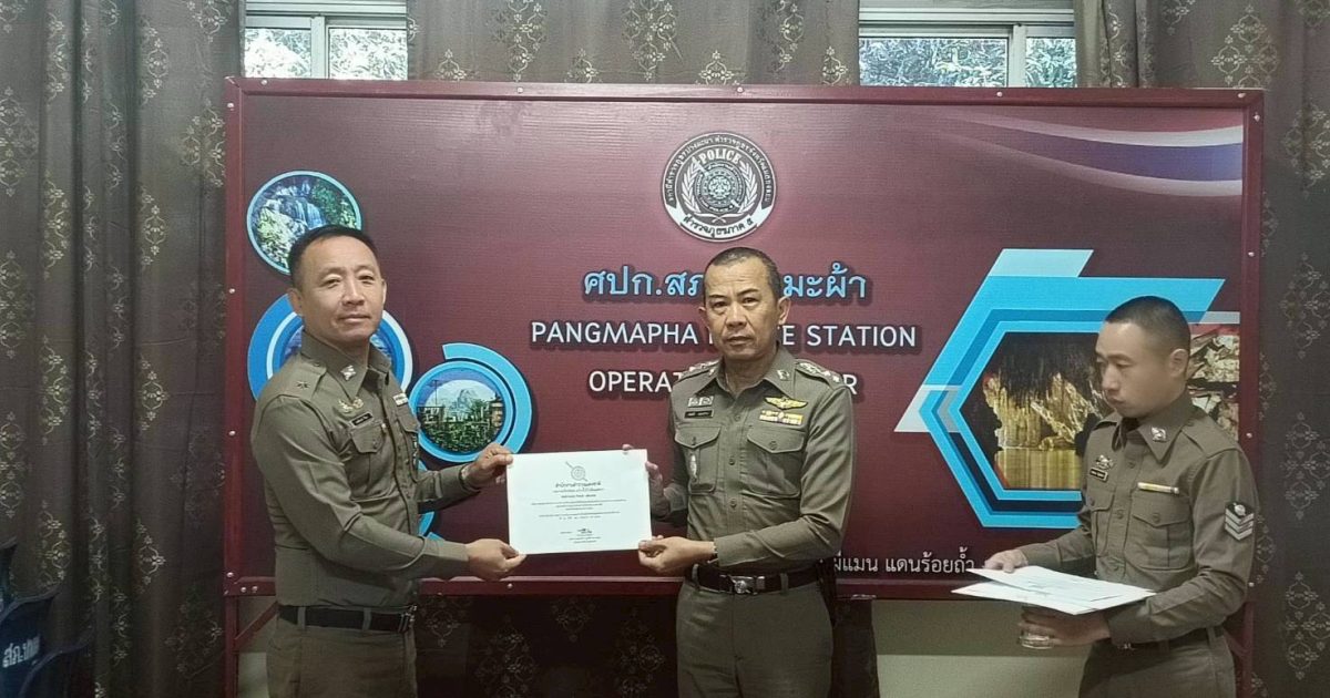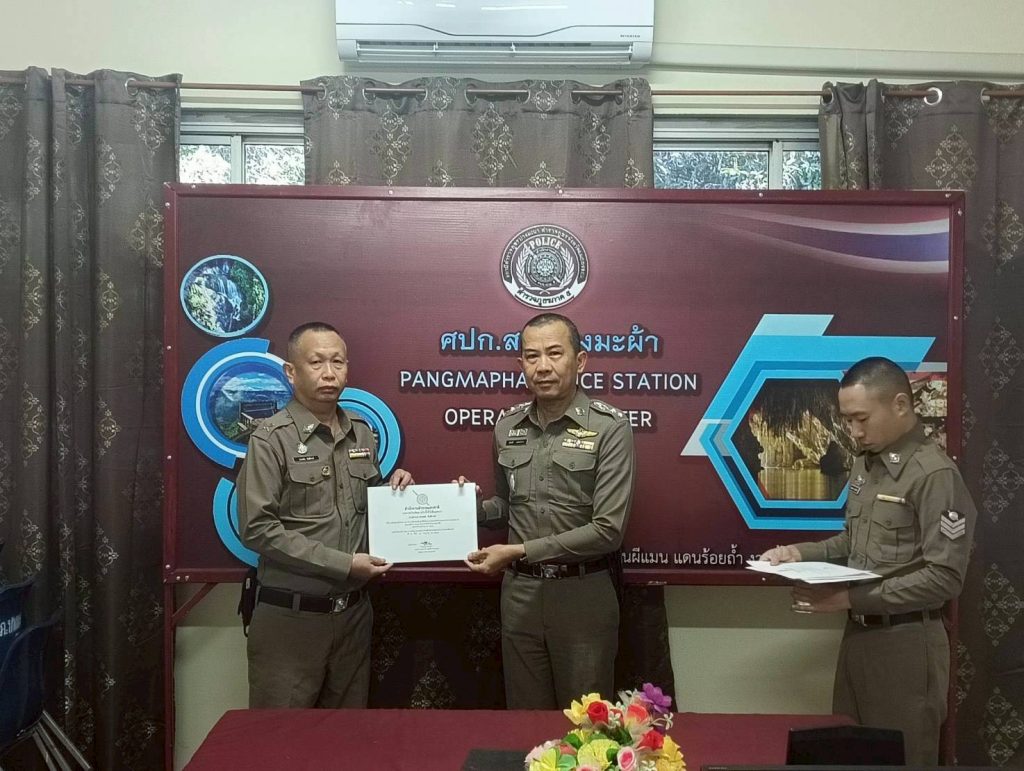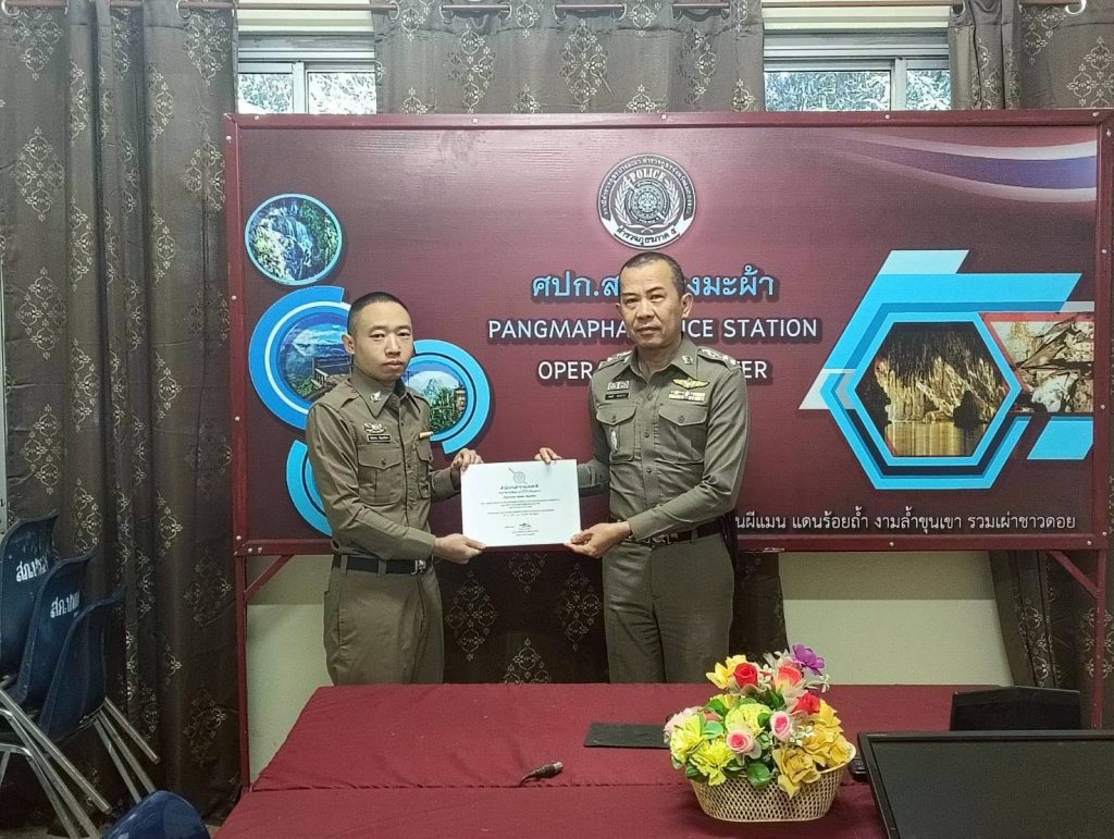 พ.ต.อ.สมบัติ แสงสว่าง ผกก.สภ.ปางมะผ้า ทำพิธีมอบใบ ประกาศนียบัตร เเกข้าราชการตำรวจ ในสังกัด สภ.ปางมะผ้า เเกผู้ที่ครองตนในศีลธรรม