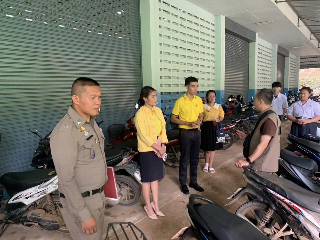 หลังจากประชุมหารือแล้ว จึงร่วมกันออกตรวจรถจักรยานยนต์ดูความเรียบร้อยภายในโรงเรียน