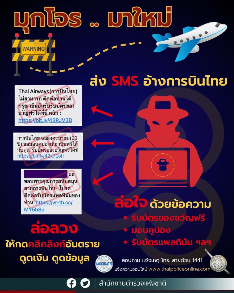 – อินโฟกราฟิก เตือนภัย “มุกโจรมาใหม่ ส่ง SMS อ้างการบินไทย”